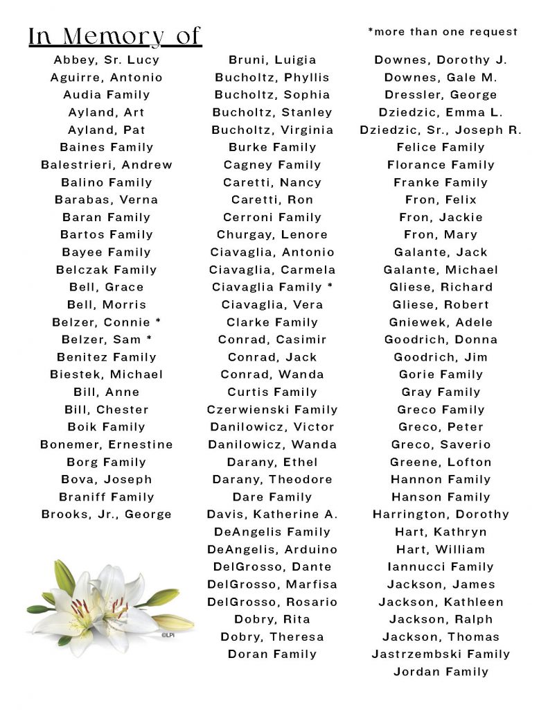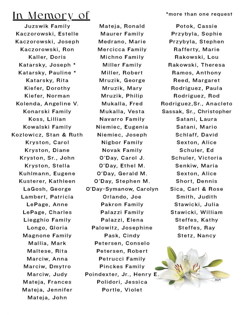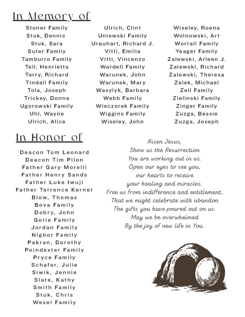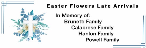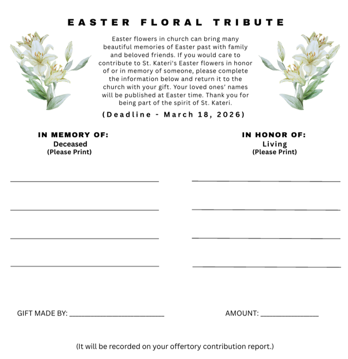 Easter flowers in church can bring many beautiful memories of Easter past with family and beloved friends. If you would care to contribute to St. Kateri’s Easter flowers in honor of or in memory of someone, please complete the information below and return it to the church with your gift. Your loved ones’ names will be published at Easter time. Thank you for being part of the spirit of St. Kateri.