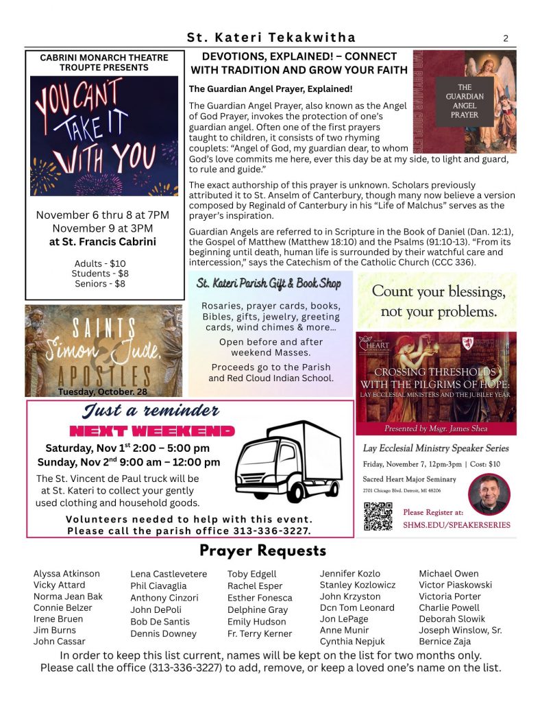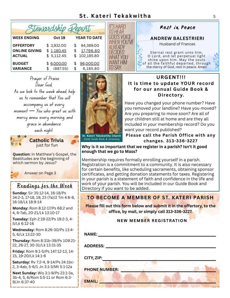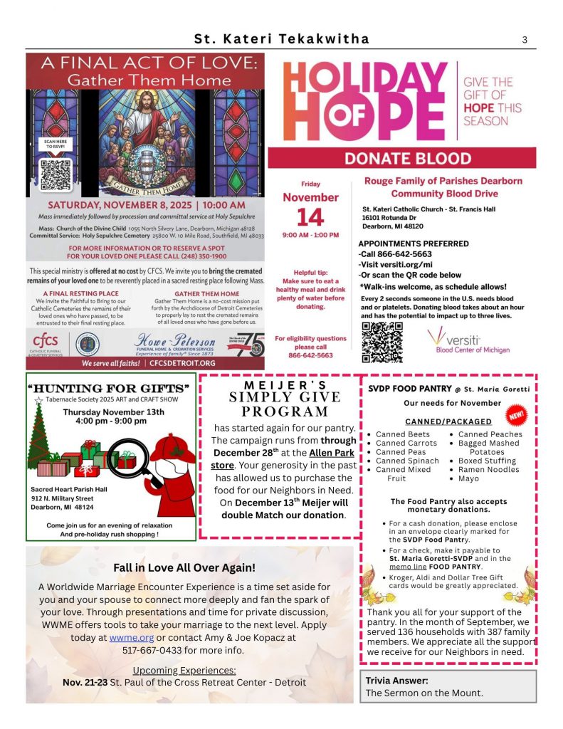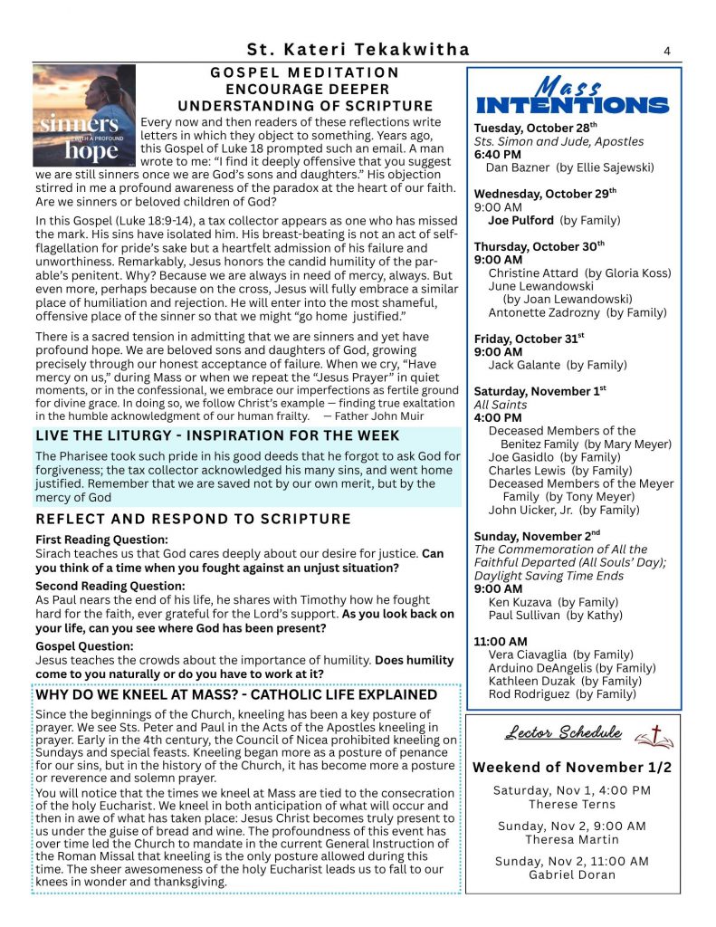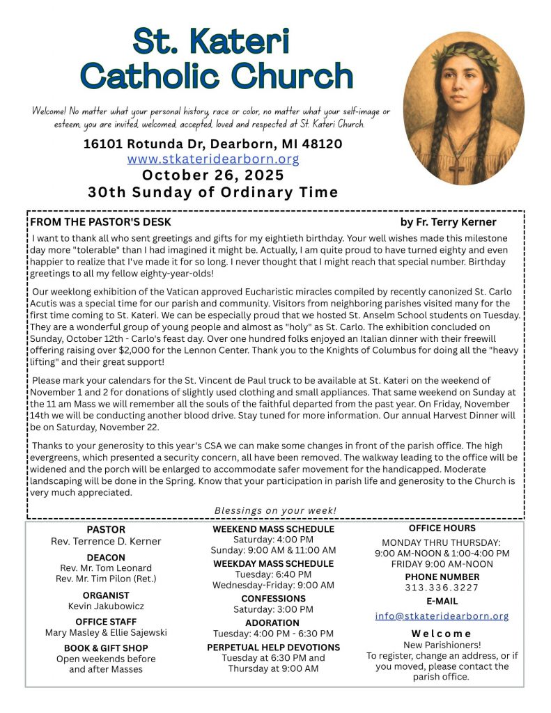 Please mark your calendars for the St. Vincent de Paul truck to be available at St. Kateri on the weekend of November 1 and 2 for donations of slightly used clothing and small appliances. That same weekend on Sunday at the 11 am Mass we will remember all the souls of the faithful departed from the past year. On Friday, November 14th we will be conducting another blood drive. Stay tuned for more information. Our annual Harvest Dinner will be on Saturday, November 22. Thanks to your generosity to this year’s CSA we can make some changes in front of the parish office. The high evergreens, which presented a security concern, all have been removed. The walkway leading to the office will be widened and the porch will be enlarged to accommodate safer movement for the handicapped. Moderate landscaping will be done in the Spring. Know that your participation in parish life and generosity to the Church is very much appreciated.Blessings on your week!