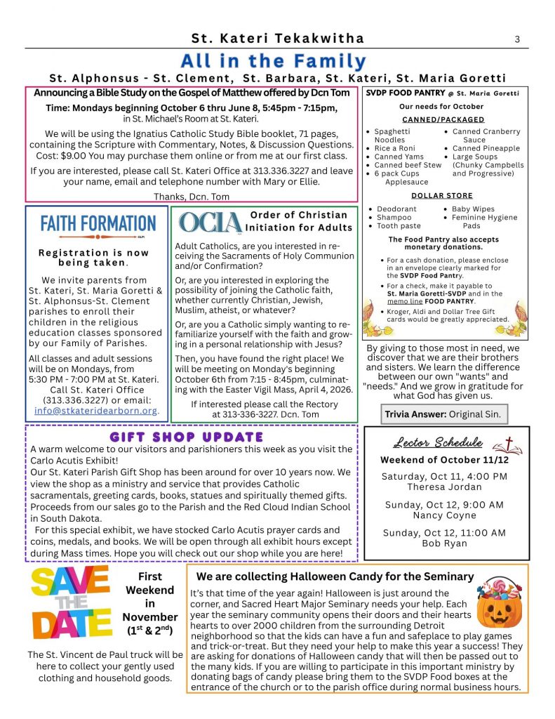 This weekend we begin the weeklong celebration of the gift of Eucharist. The centerpiece is of course, the viewing of the description of several individual miracles related to the Eucharist. The Vatican approved exhibition was compiled by young Carlo Acutis, who died at age fifteen and canonized last month. A normal teen and expert at computers, Carlo has been given the title: “First Millennial Saint”.