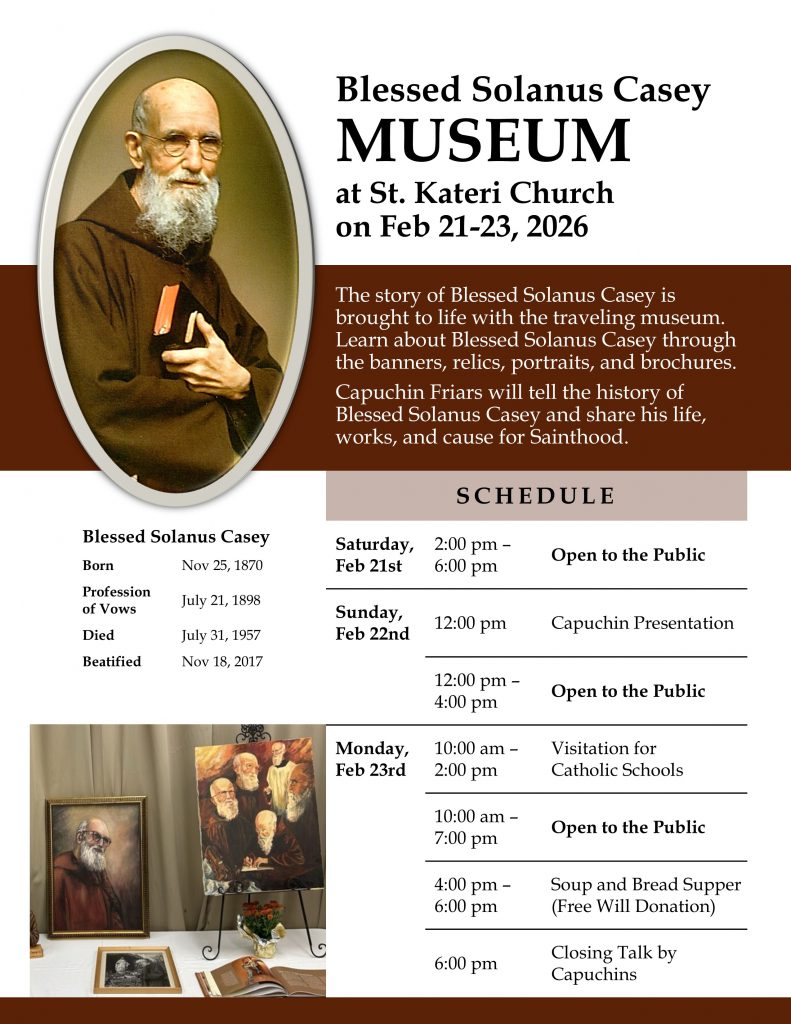 Capuchin Friars will tell the history of Blessed Solanus Casey and share his life, works, and cause for Sainthood.